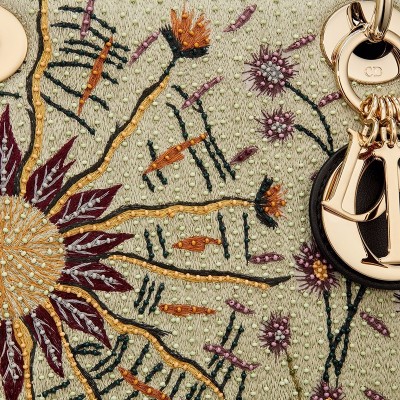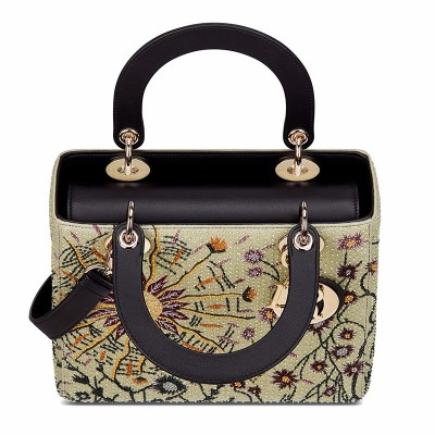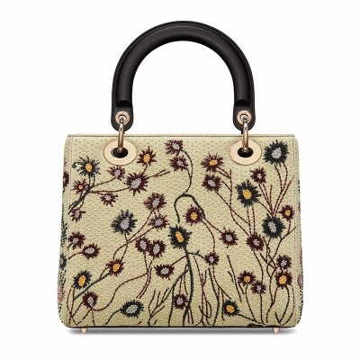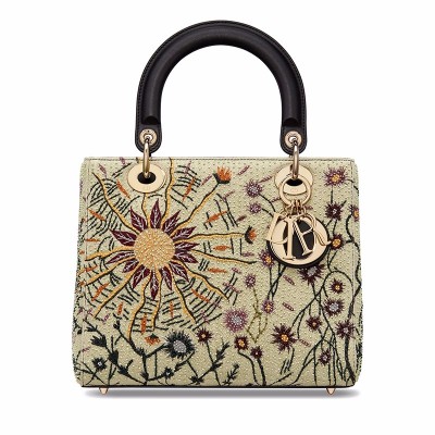【包邮包税】DIOR/迪奥 2020春夏新款 Lady Dior系列 淡黄色小牛皮拼接彩绣中号戴妃包手提包 M0565OURV_M886
