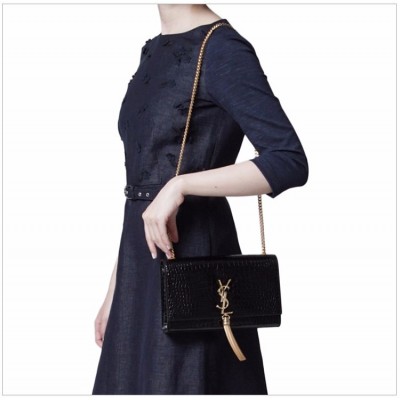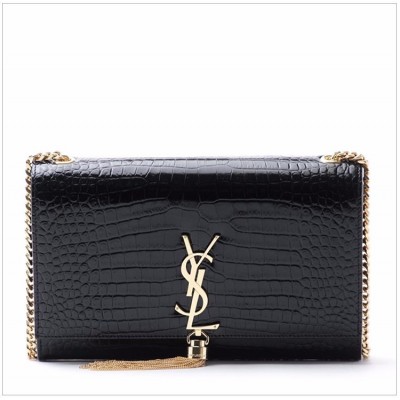 YSL 圣罗兰 2017新款 MONOGRAM系列 女士黑色牛皮logo流苏链条单肩斜挎包