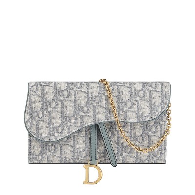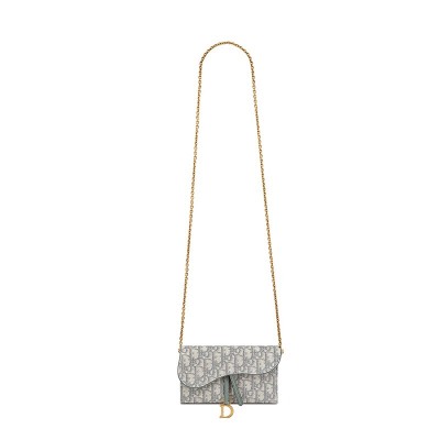 这款 Saddle 钱包采用灰色 Dior Oblique 提花帆布制成,是一款兼具现代感和精致感的混合单品。不对称翻盖和做旧金色金属 D 轭增强了它的美感。得益于其可拆卸链条,这款钱包可肩背、斜挎或手提。